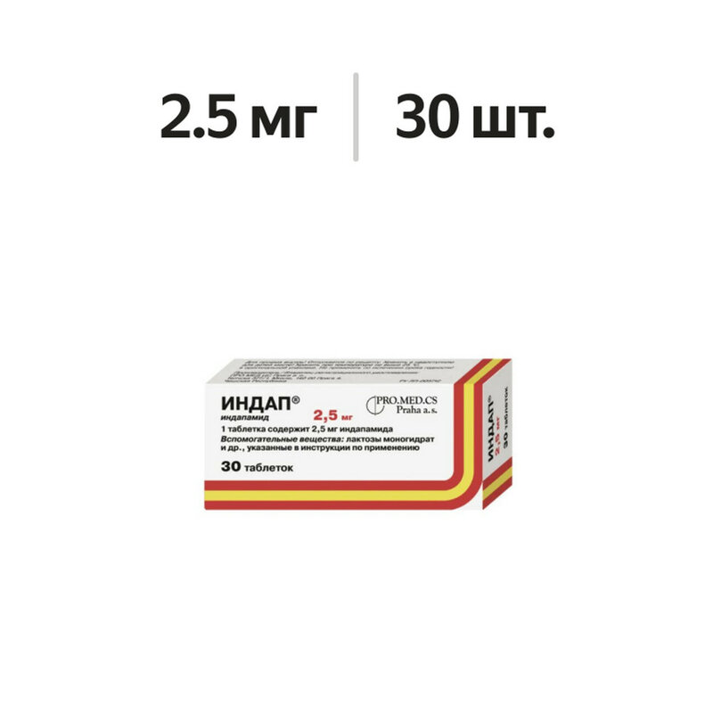 индапамид 2.5 мг. Вспомогательные вещества: лактозы моногидрат гранулированный, лактозы моногидрат, целлюлоза микрокристаллическая гранулированная, целлюлоза микрокристаллическая, тальк, магния стеарат, кремния диоксид коллоидный безводный, смесь "ТопМилл® оранжевый 231.05 C", содержащая: краситель железа оксид желтый, краситель железа оксид красный, лактозы моногидрат.