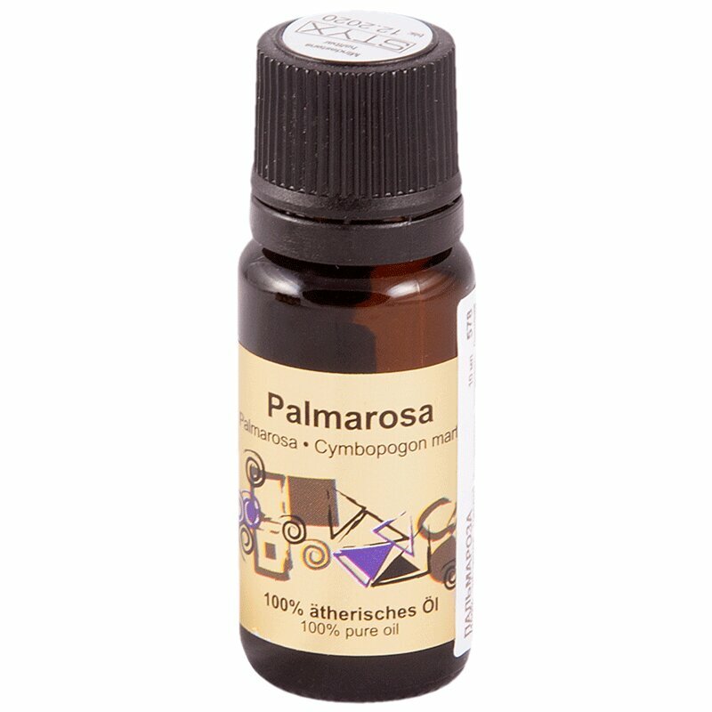 Антиоксидантное, антисклеротическое средство. Освежает, увлажняет, регенерирует, обновляет кожу. Устраняет нейродермиты, воспалительные элементы, заживляет вялорубцующиеся раны. Дезодорирует кожу, нормализует липосекрецию, устраняет гипергидрозы. Восстанавливает здоровый состав гидролипидной мантии эпидермиса. Средство интим-косметики. Устраняет бромозы тела. Очень высокие концентрации пальмарозы использовались в хирургии в качестве анестезирующего средства. Считалось, что пальмароза восстанавливает жизненную энергию, механизмы самосохранения, устраняет суицидальную готовность и жалость к себе.