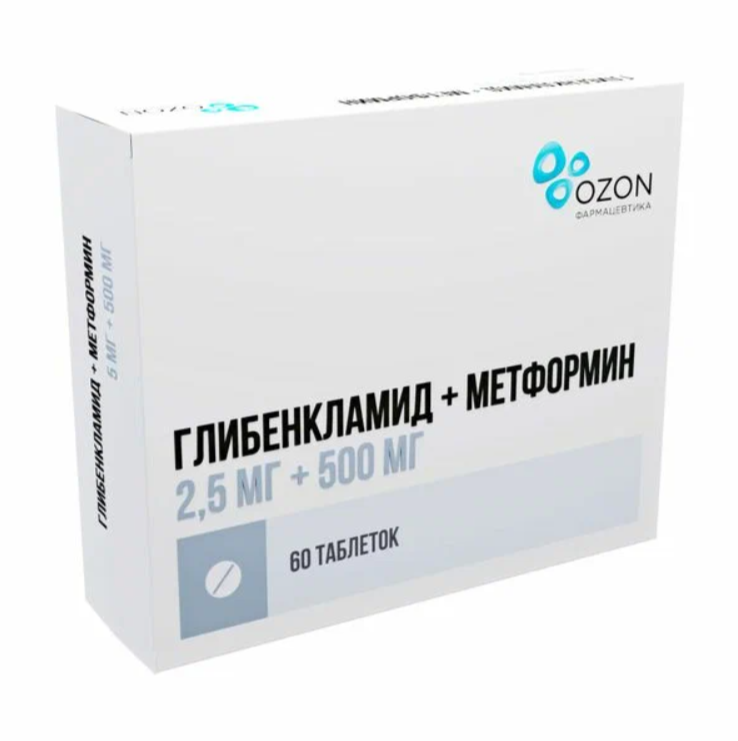 1 таблетка содержит: действующие вещества: глибенкламид - 2,5 мг; метформина гидрохлорид - 500,0 мг.