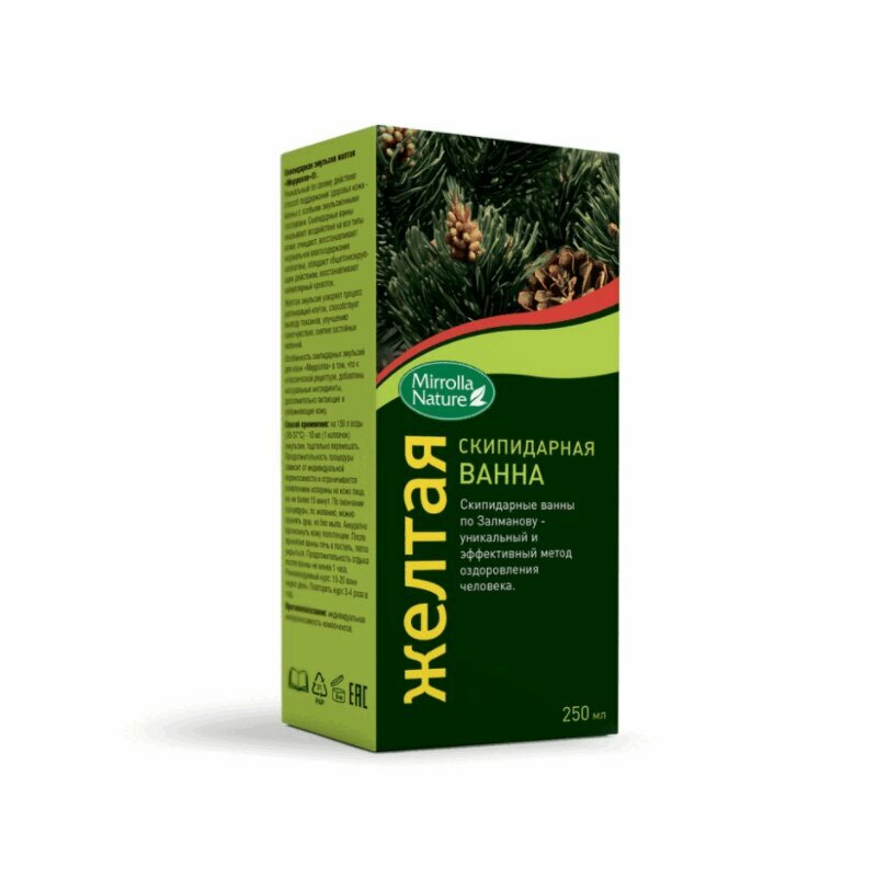 Специальные особенности: Без ароматизаторов, без консервантов, без красителей, не содержит парабенов. Скипидарные ванны оказывают воздействие на все типы кожи: очищают, восстанавливают нормальное влагосодержание коллагена, обладают общетонизирующим действием, восстанавливают капиллярный кровоток. Желтая эмульсия улучшает кровоток, оказывает тонизирующее действие, способствует нормализации жирового обмена. Особенность скипидарных эмульсий для ванн «Мирролла» в том, что к классической рецептуре, добавлены натуральные ингредиенты, дополнительно питающие и увлажняющие кожу.