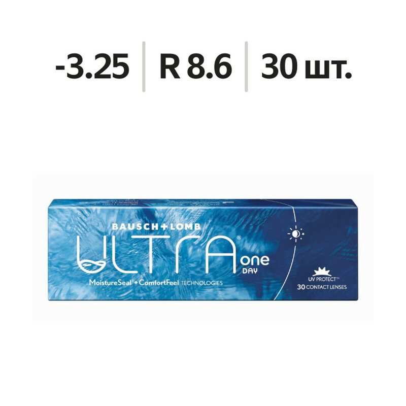 Однодневные силикон-гидрогелевые контактные линзы Bausch + Lomb ULTRA® ONE DAY позволяют выйти за рамки существующих границ контактной коррекции. Однодневные силикон-гидрогелевые контактные линзы Bausch + Lomb ULTRA® ONE DAY сочетают в себе две передовые технологии, которые работают вместе как единая система. Улучшенная технология MoistureSeal® и технология ComfortFeel (КомфортФил) способствующие комфорту до 16 часов ношения и поддержанию естественной среды и стабильности слёзной плёнки. Благодаря улучшенной технологии MoistureSeal® обеспечивает высокую кислородопроницаемость (Dk/t 134) и высокое влагосодержание внутри материала (55%). Высокая кислородная проницаемость (134 Dk/t) способствует поддержанию здорового вида глаз.