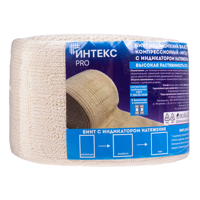 Бинт эластичный Интекс Pro с индикатором натяжения высокой растяжимости с застежкой 5 м х 8 см