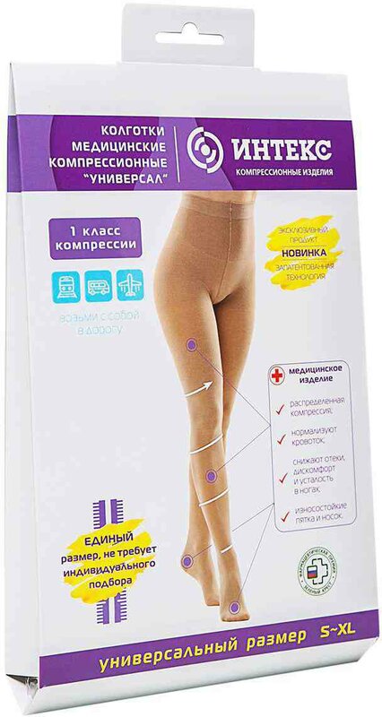 Колготки Интекс Универсал 1 класс компрессии, женские с закрытым носком, бежевые. Теперь подбор и покупка компрессионного трикотажа, стала удобней: достаточно определиться с типом изделия и выбрать подходящий цвет. Компрессия же при этом остается постоянной - 18-21 мм рт. ст. Максимальное давление создается на уровне лодыжки, уменьшаясь по направлению вверх. Такая конструкция позволяет активировать венозный отток и улучшить движение крови к сердцу. Размер один для всех. Серия рассчитана на стандартные параметры в рамках размеров S~XL. Размеры: Единый (S~XL) обхват в области голеностопного сустава, см. 19-32, обхват в области икроножной мышцы, см. 29-51, обхват в области бедра, см. 44-72, обхват бедер, см. до 128, обхват талии, см. до 114, длина ноги от паха до пятки, см. 68-82, размер стопы 35-41.