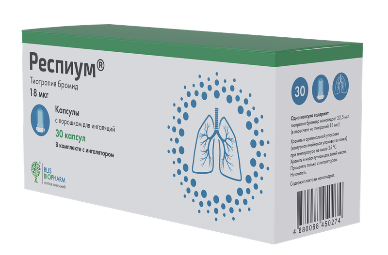Тиотропия бромид - антимускариновый препарат продолжительного действия м-холиноблокатор, в клинической практике часто называемый антихолинергическим средством. Он обладает одинаковым сродством к различным подтипам мускариновых рецепторов от M1 до M5. Результатом ингибирования М3-рецепторов в дыхательных путях является расслабление гладкой мускулатуры. Бронходилатирующий эффект зависит от дозы и сохраняется не менее 24 часов. Значительная продолжительность действия связана, вероятно, с очень медленной диссоциацией от М3-рецепторов, по сравнению с ипратропия бромидом. При ингаляционном способе введения тиотропия бромид как N-четвертичное антихолинергическое средство оказывает местный избирательный эффект, при этом в терапевтических дозах не вызывает системных м-холиноблокируюгцих побочных эффектов. Диссоциация от М2-рецепторов происходит быстрее, чем от М3. Высокое сродство к рецепторам и медленная диссоциация обуславливают выраженный и продолжительный бронходилатирующий эффект у пациентов с хронической обструктивной болезнью легких.