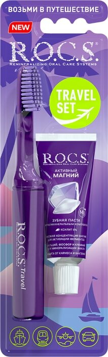Набор для путешествий R.O.C.S. включает в себя складную зубную щетку и зубную пасту, что позволит в Складная зубная щетка – оптимальный вариант для поездок, путешествий и командировок. Щетка компактно складывается и не занимает много места в багаже. Футляр имеет отверстия для вентиляции щетины в сложенном состоянии.
