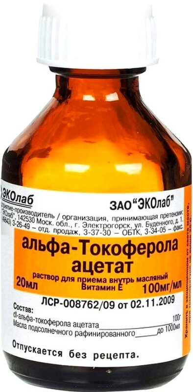 Витамин E. Оказывает антиоксидантное действие, участвует в биосинтезе гема и белков, пролиферации клеток, тканевом дыхании, других важнейших процессах тканевого метаболизма, предупреждает гемолиз эритроцитов, препятствует повышенной проницаемости и ломкости капилляров; стимулирует синтез белков и коллагена.При приеме внутрь абсорбция составляет 50-80%; в процессе всасывания образует комплекс с липопротеидами (внутриклеточные переносчики токоферола). Для абсорбции необходимо наличие желчных кислот. Связывается с альфа 1 - и бета-липопротеидами, частично - с сывороточным альбумином. При нарушении обмена белков транспорт затрудняется. C max достигается через 4 ч. Метаболизируется в печени до производных, имеющих хиноновую структуру (некоторые из них обладают витаминной активностью). Выделяется с грудным молоком. У недоношенных и новорожденных детей возможна его кумуляция. Депонируется в надпочечниках, гипофизе, семенниках, жировой и мышечной ткани, эритроцитах, печени. Более 90% выводится с желчью, 6% - почками.