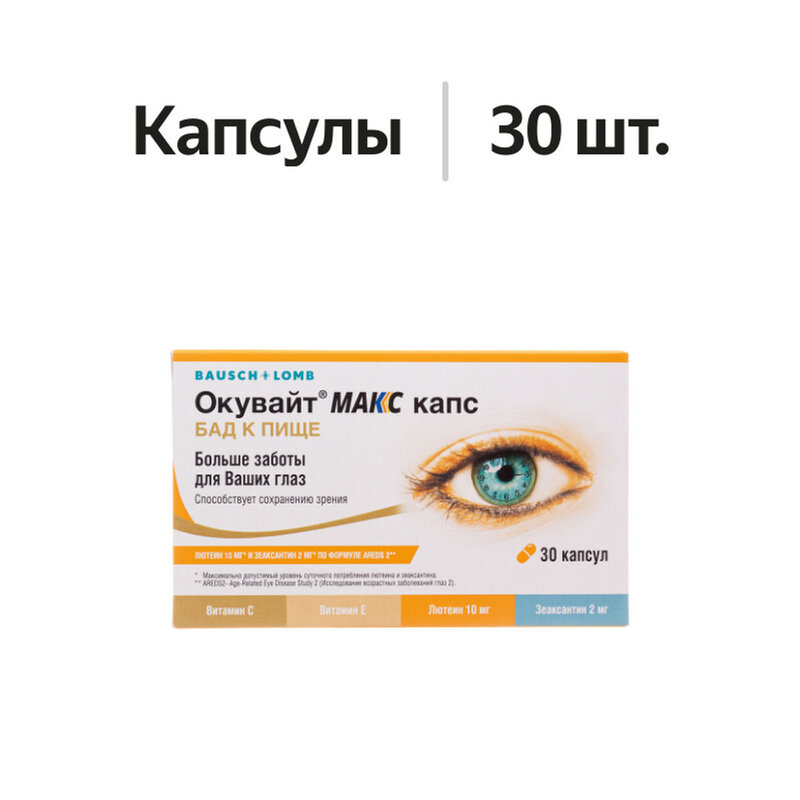 «Окувайт Макс капс» – еще больше заботы для Ваших глаз. В ходе нашей жизни организм подвергается постоянному стрессу. Факторы окружающей среды, частое взаимодействие с компьютером, разрушающее воздействие солнечного света, возрастмогут приводить к естественному процессу дегенерации (разрушения) сетчатки, что может провоцировать ухудшение зрения. Возрастные изменения в сетчатке могут носить необратимый характер и приводить к частичной или даже полной потере зрения. Поэтому профилактика старения сетчатки глаз имеет большое значение. С возрастомили у людей, получающих несбалансированную диету, может возникать дефицит антиоксидантов, важность которых была показана в исследовании АРЕДС, в ходе которого было отмечено замедление ухудшения зрения у людей старше 55 лет, принимавших комбинацию антиоксидантов и цинка. Для сохранения здорового зрения важны: здоровый образ жизни, периодический отдых, специальные упражнения для глаз, защита глаз от прямого солнечного света, а также регулярный мониторинг зрения, начиная с 50 лет. Лютеин – каротиноид, который служит естественной защитой сетчатки от слишком яркого света. Зеаксантин – желтый пигмент из группы ксантофиллов, накапливается в пигменте сетчатки глаза человека, играет роль защитного механизма от индуцируемого светом повреждения клеток, способствует разрушению липофусцина. Клинические исследования показали, что длительный прием лютеина и зеаксантина повышает плотность макулярного пигмента и способствует поддержанию высокой остроты зрения. Витамины С и Е, цинк,входящие в состав биологически активной добавки к пище «Окувайт Макс капс», являясь естественными антиоксидантами, помогают снизить воздействие вредных факторов и сохранить зрение, способствуют укреплению кровеносных сосудов, в том числе сосудов глазного дна. Витамин С– один из главных, необходимых человеку антиоксидантов. Участвует в регулировании окислительно-восстановительных процессов, углеводного обмена, свертываемости крови, регулирует восстановление зрительных пигментов, уменьшает повышенное внутриглазное давление, снижает риск развития глаукомы. При одновременном приеме с витамином С лютеин всасывается быстрее. Витамин Е выполняет роль биологического антиоксиданта, инактивирующего свободные радикалы и тем самым препятствующего их образованию. Препятствует повышенной ломкости и проницаемости капилляров. Является профилактикой появления и развития катаракты. Цинк участвует в процессах антиоксидантной защиты клеточных мембран. Защищает глаза от повреждений вследствие воздействия ультрафиолета и яркого света. Прием цинка способствует замедлению возрастных изменений сетчатки. Дефицит цинка может приводить к снижению цветовосприятия, трудностям со зрением в ночное время, кобразованию катаракты.У пожилых людей дефицит цинка может быть связан с такими проблемами, какпотеря вкуса и аппетита, депрессия, трудности с концентрацией внимания и умственная слабость. Медьиграет важную роль в удалении свободных радикалов, которые могут повреждать клетки сетчатки. Селен – сильный антиоксидант, который предохраняет клетки от токсического действия перекисных радикалов.