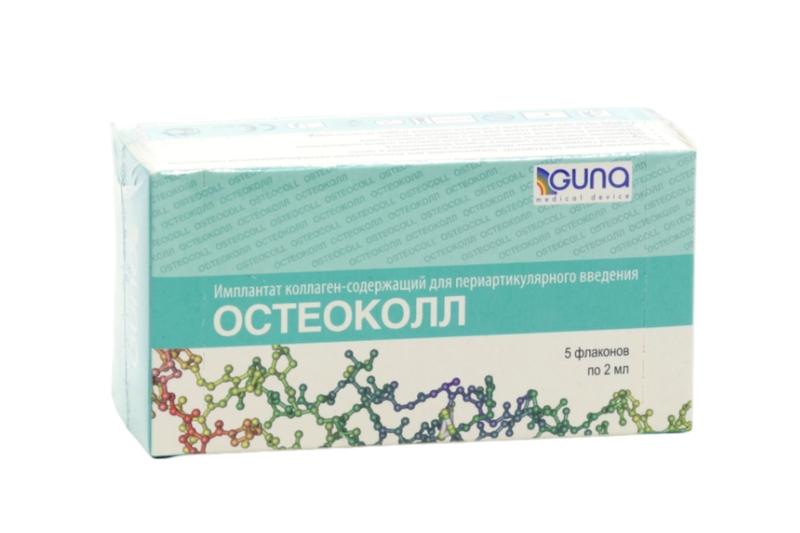 Остеоколл представляет собой имплант коллаген - содержащий для периартикулярного введения, который способствует увеличению объема движений благодаря замедлению процессов деградации хрящевой ткани суставных поверхностей и восстановлению повреждений, возникших в результате: - старения - нарушения осанки - сопутствующих хронических заболеваний - ушибов и травм - токсических поражений хрящевой ткани. Остеоколл обладает следующими терапевтическими функциями: 1. Барьерный эффект 2. Смазывающий эффект 3. Механическая поддержка при проведении другого медикаментозного лечения.