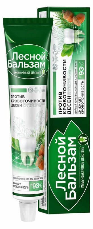 Зубная паста Лесной бальзам Кора дуба и пихта 75 мл. Профилактическая зубная паста Лесной бальзам c иммуноактивным действием помогает решить проблему кровоточивости десен и в 2 раза улучшает работу собственного иммунитета полости рта, снижая риск развития проблем с деснами.