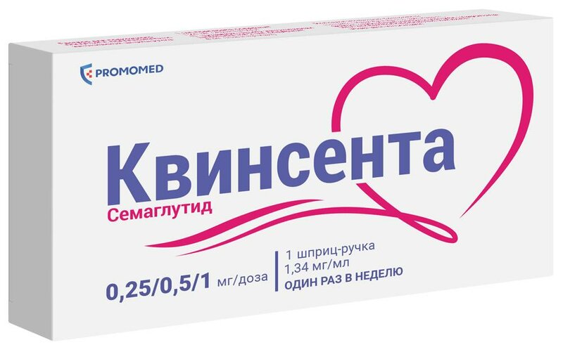 Препарат Квинсента содержит в качестве действующего вещества семаглутид, который представляет собой химически синтезированный пептид и является агонистом рецепторов ГПП-1 (ГПП-1Р). Семаглутид – это аналог человеческого ГПП-1, имеющий 94 % гомологий с аминокислотной последовательностью эндогенного ГПП-1.
