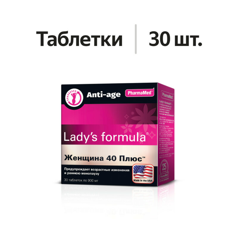"Lady`s formula женщина 40 плюс" регулирует обмен веществ, предупреждает набор лишнего веса, способствует повышению упругости и эластичности кожи, поддерживает структуру коллагена и препятствует ее разрушению ферментами, предупреждает преждевременное старение и раннюю менопаузу, нормализует обмен женских половых гормонов.