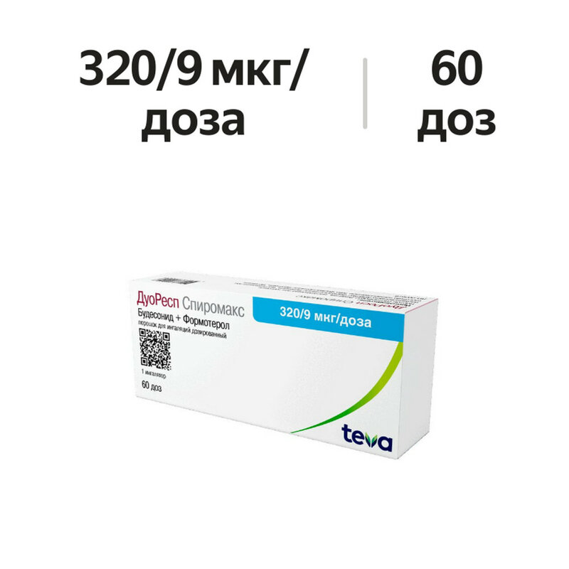 ДуоРесп Спиромакс содержит формотерол и будесонид, которые имеют разные механизмы действия и проявляют аддитивный эффект в отношении снижения частоты обострений бронхиальной астмы и ХОБЛ. Особые свойства будесонида и формотерола дают возможность использовать их комбинацию одновременно в качестве поддерживающей терапии и для купирования приступов, или как поддерживающую терапию бронхиальной астмы. Будесонид - ГКС, который после ингаляции оказывает быстрое (в течение нескольких часов) и дозозависимое противовоспалительное действие на дыхательные пути, снижая выраженность симптомов и частоту обострений бронхиальной астмы. При назначении ингаляционного будесонида отмечается меньшая частота возникновения серьезных нежелательных эффектов, чем при использовании системных ГКС. Уменьшает выраженность отека слизистой бронхов, продукцию слизи, образование мокроты и гиперреактивность дыхательных путей. Точный механизм противовоспалительного действия ГКС неизвестен. Формотерол - селективный агонист β2-адренорецепторов, который после ингаляции вызывает быстрое и длительное расслабление гладкой мускулатуры бронхов у пациентов с обратимой обструкцией дыхательных путей. Бронхолитическое дозозависимое действие наступает быстро, в течение 1-3 мин после ингаляции и сохраняется в течение как минимум 12 ч после приема разовой дозы. Будесонид + Формотерол Бронхиальная астма: Добавление формотерола к будесониду уменьшает выраженность симптомов бронхиальной астмы, улучшает функцию бронхов и уменьшает частоту обострений заболевания. Действие препарата ДуоРесп Спиромакс на функцию бронхов соответствует действию комбинации монопрепаратов будесонида и формотерола и превышает действие одного будесонида. Во всех случаях для купирования приступов использовался бета2-адреностимулятор короткого действия. Не отмечалось снижения противоастматического действия с течением времени. Препарат обладает хорошей переносимостью. Препарат в качестве поддерживающей терапии в комбинации с бета2-адреномиметиком короткого действия для купирования приступов назначался пациентам в возрасте от 6 до 11 лет в течение 12 недель (две ингаляции по 80/4.5 мкг/ингаляция 2 раза/сут). Были отмечены улучшение легочной функции и хорошая переносимость терапии в сравнении с соответствующей дозой будесонида при ингаляции из системы доставки Турбухалер. Клиническая эффективность в качестве поддерживающей терапии и для купирования приступов (только для дозировки 160/4.5). В ходе наблюдения за 4447 пациентами, получавшими комбинацию будесонид/формотерол в качестве поддерживающей терапии и для купирования приступов в течение от 6 до 12 месяцев, было отмечено статистически и клинически значимое уменьшение числа тяжелых обострений, увеличение периода времени до наступления первого обострения в сравнении с комбинацией будесонид/формотерол или с будесонидом в качестве поддерживающей терапии и бета2-адреномиметиком для купирования приступов. Также отмечался эффективный контроль над симптомами заболевания, легочной функцией и снижение частоты назначения ингаляций для купирования приступов. Не было выявлено развития толерантности к назначенной терапии. У пациентов, обратившихся за медицинской помощью в связи с развитием острого приступа бронхиальной астм