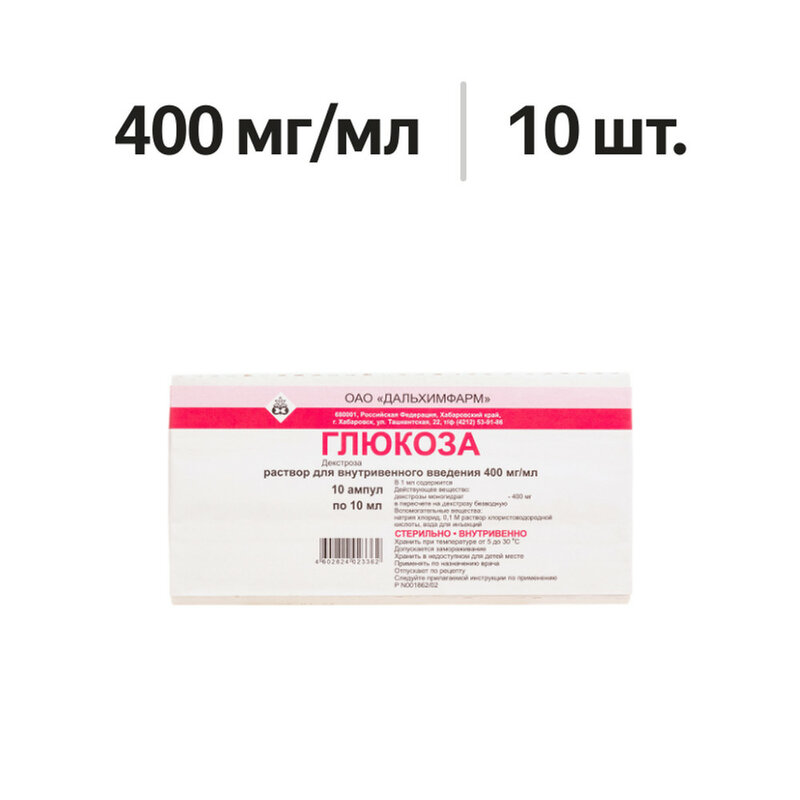 Действующее вещество: декстрозы моногидрат в пересчете на декстрозу безводную – 400 мг. Вспомогательные вещества: натрия хлорид – 0.26 мг, хлористоводородной кислоты раствор 0.1М – до рН 3-4.1, вода для инъекций – до 1 мл.