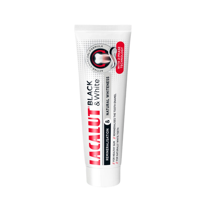 Зубная паста Lacalut black&white c порошком древесного угля безопасно и тщательно очищает зубную эмаль от налета, реминерализует эмаль, полирует ее поверхность и обеспечивает гладкость на долгое время. Отбеливающий комплекс пирофосфатов и мягких абразивов осветляет зубную эмаль благодаря удалению зубного налета с поверхности эмали. Гидроксиапатит и фторид натрия реминерализуют эмаль, восстанавливают ее внешние слои и защищают от кариеса. Лактат алюминия и хлоргексидин заботится о деснах и предотвращает их воспаление. Содержание ионов фтора 1450 ррm. Абразивность 93-96.