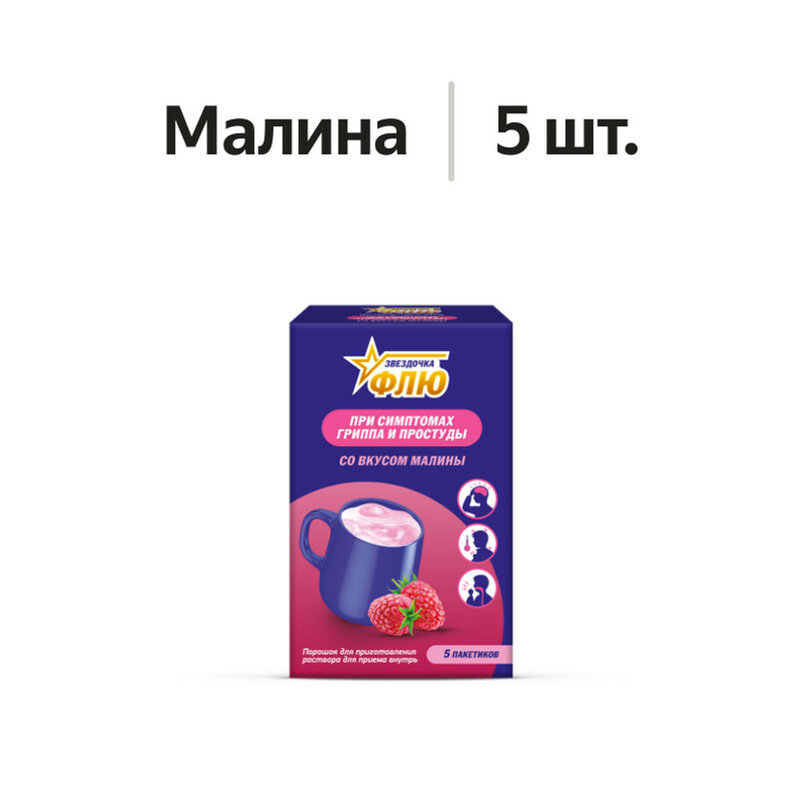 В 1 порошке содержится: парацетамол 325 мг, фенирамина малеат 20 мг, фенилэфрина гидрохлорид 10 мг, аскорбиновая кислота 50 мг. Вспомогательные вещества: повидон 25 мг, маннитол 2 г, кальция фосфат 30 мг, сахароза 11.29 г, лимонная кислота 1 г, натрия цитрат 100 мг, аспартам 10 мг, ароматизатор малиновый 140 мг.