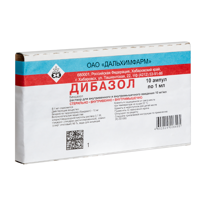 Действующее вещество: бендазола гидрохлорид (бендазол) - 10 мг. Вспомогательные вещества: хлористоводородной кислоты раствор 0,1 М - 0,01 мл, глицерол (глицерин дистиллированный) - 108 мг, этанол (спирт этиловый) 96 % - 0,1 мл, вода для инъекций - до 1 мл