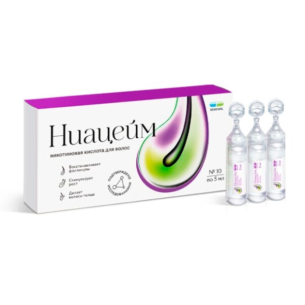 Ниацейм® — косметическое средство против выпадения и для роста волос. Механизм действия Ниацейма: Расширяет периферические кровеносные сосуды. Усиливая микроциркуляцию в коже головы. Улучшает транспортировку кислорода и полезных микроэлементов. Восстанавливает нормальное питание волосяных фолликулов. Эффекты от применения Ниацейма: Пробуждает спящие волосяные луковицы и способствует росту новых волос. Восстанавливает и регенерирует поврежденные луковицы. Препятствует выпадению волос, укрепляя корни и противодействуя уплотнению коллагена вокруг корня волоса. Способствует выработке меланина – пигмента, который делает локоны блестящими, сохраняет их цвет, предотвращает преждевременное появление седины. Не сушит кожу в случае многократного использования, что доказано дерматологическими тестами.
