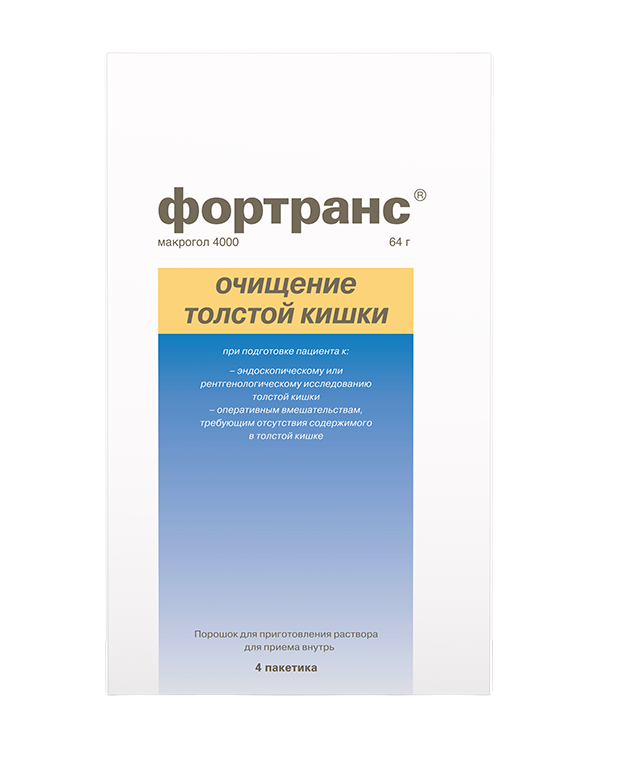 Препарат Фортранс показан к применению у взрослых в возрасте от 18 лет для очищения толстой кишки при подготовке к: эндоскопическому или рентгенологическому исследованию толстой кишки; оперативным вмешательствам, требующим отсутствия содержимого в толстой кишке.