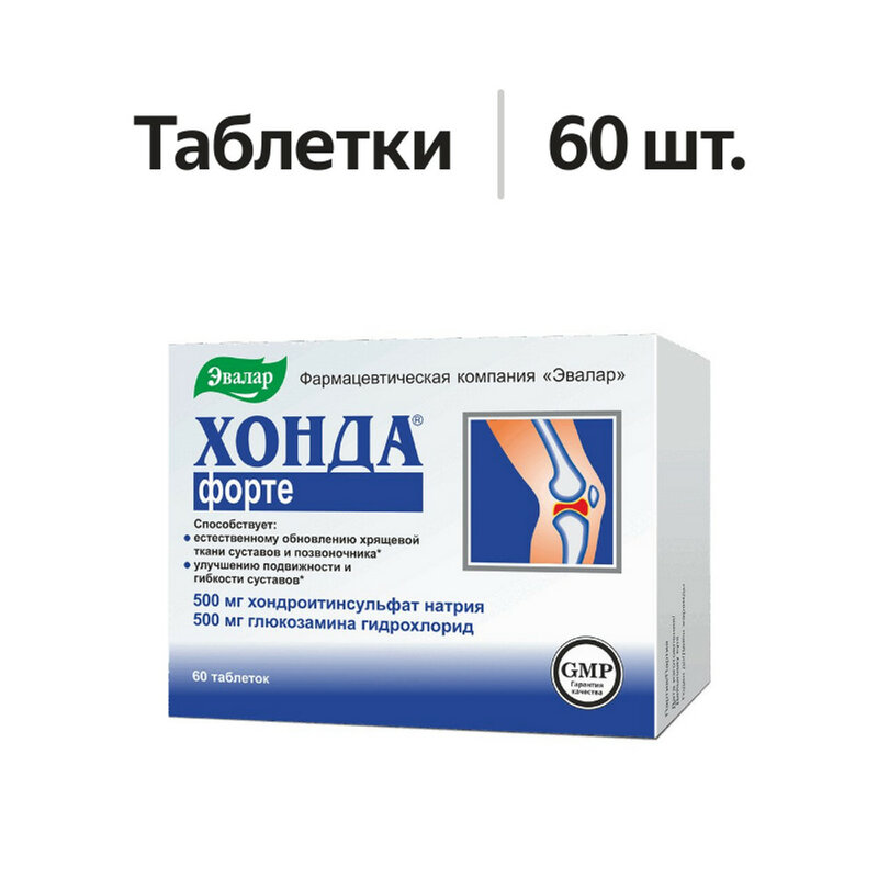 Хондроитинсульфат натрия поддерживает функциональную способность суставов и снижает дискомфорт движений. Он защищает хрящ и обладает способностью поддерживать естественное обновление клеток хрящевой ткани. Глюкозамина гидрохлорид является тем природным компонентом, который обеспечивает защиту клеток хрящевой ткани, стимулирует выработку коллагена, является структурным компонентом сухожилий, суставной жидкости, соединительной ткани, кожи и костей. Добавление в состав Хонда форте экстракта коры ивы белой и экстракта корня лопуха дополнительно способствует поддержанию функционального состояния хрящевой ткани и водно-солевого обмена.