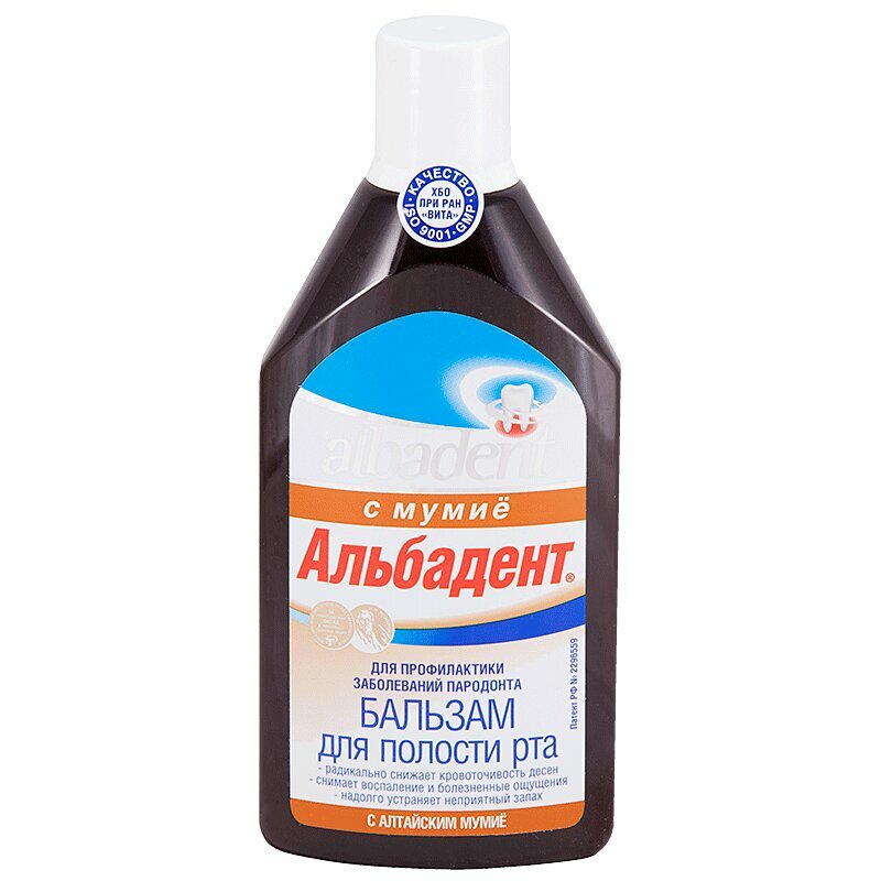 Бальзам препятствует размножению патогенных микробов в полости рта. В короткие сроки устраняет первые симптомы пародонтита — кровоточивость и отёчность, улучшает минеральный обмен и питание дёсен и слизистой, ускоряет заживление тканей, удаляет зубной налет и неприятный запах изо рта. Специалисты рекомендуют использовать противовоспалительный бальзам «Альбадент» с мумиё как в период ремиссии, утром и вечером, после чистки зубов, так и при обострении пародонтита как промежуточное средство гигиены в виде ванночек и пассивных полосканий. Специальные добавки препятствуют развитию кариеса и мягко отбеливают зубную эмаль.