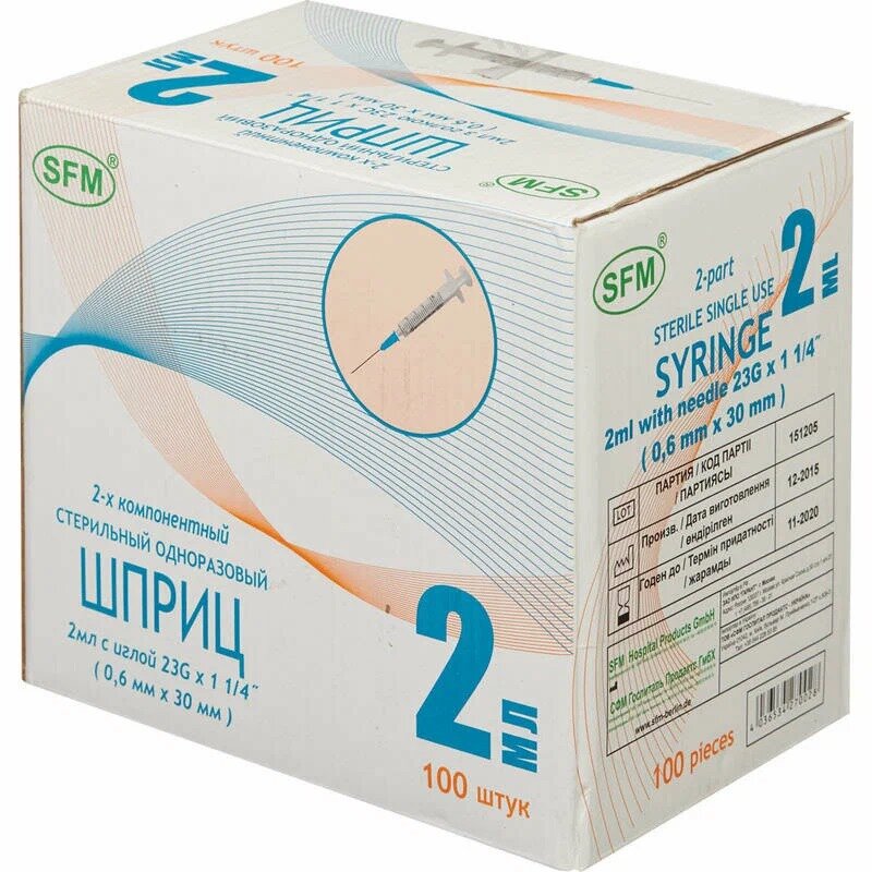 Шприц SFM 2-х компонентный с иглой 23G 0.6 х 30 мм 2 мл 100 шт.