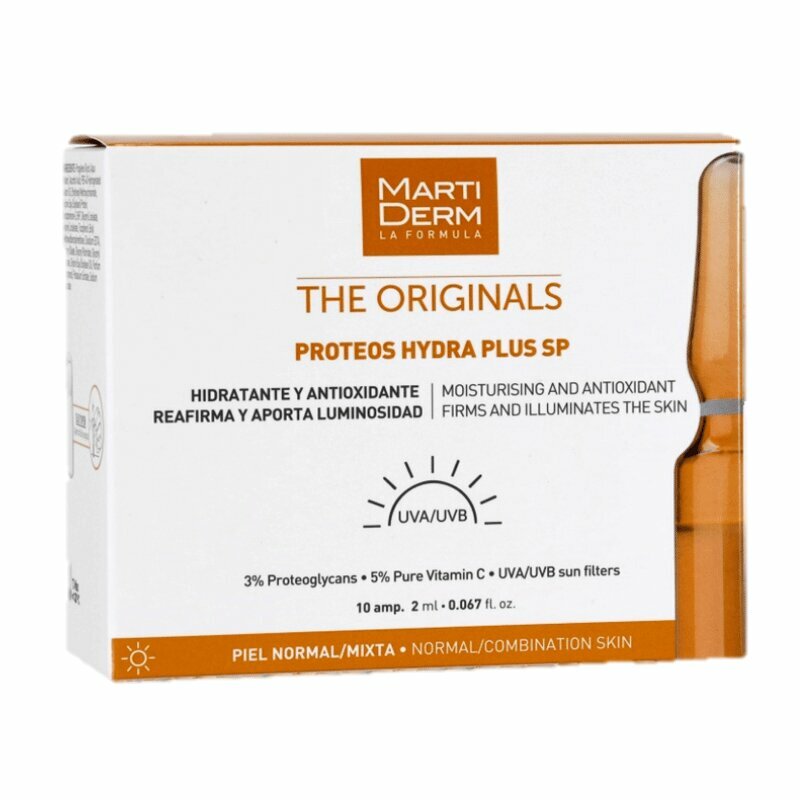 Martiderm The Originals Proteos Hydra Plus SP - это легкая сыворотка в индивидуальных ампулах, которая мгновенно увлажняет кожу и делает ее ярче с течением времени. С чистым витамином С и протеогликанами, а также защитой от солнца. Martiderm The Originals Proteos Hydra Plus SP осветляет и глубоко увлажняет кожу с момента ее нанесения. С протеогликанами для увлажнения кожи и чистым витамином С, чтобы получить антиоксидантный эффект и анти UVA/UVB радиационной защитой, чтобы полностью защитить кожу. Жидкая текстура очень легко впитывается и мгновенно оставляет кожу гладкой, но без каких-либо жирных ощущений. Ранее называлась Martiderm Proteoglicanos FPS.