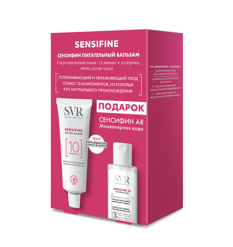 Питательный бальзам: aqua/water/eau, butyrospermum parkii (shea) butter, squalane, behenyl alcohol, beheneth-25, 1,2-hexanediol, panthenol, caprylyl glycol, citric acid, sodium polyacrylate. СЕНСИФИН AR. Мицеллярная вода: aqua (purified water), propanediol, peg-6 caprylic/capric glycerides, peg-7 glyceryl cocoate, pentylene glycol, polysorbate 20, niacinamide, 1,2-hexanediol, citric acid, sodium hydroxide, cetrimonium bromide