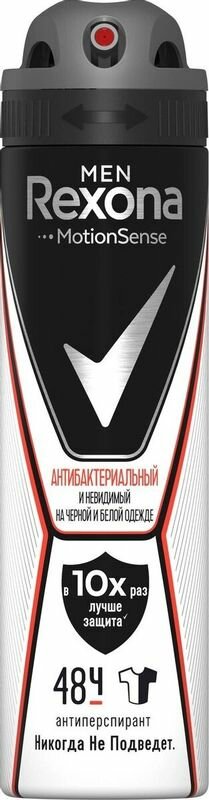 Дезодорант - антиперспирант спрей Rexona Men Антибактериальный и невидимый на черной и белой одежде с технологией двойной защиты: нет поту, нет запаху, нет белым следам на черном и желтым пятнам на белом. В его формуле достигнут оптимальный баланс: концентрация активного компонента делает формулу невидимой на коже и одежде и обеспечивает в 10 раз более эффективную защиту против бактерий, вызывающих неприятный запах, а также бережно относится к нежной коже подмышек.