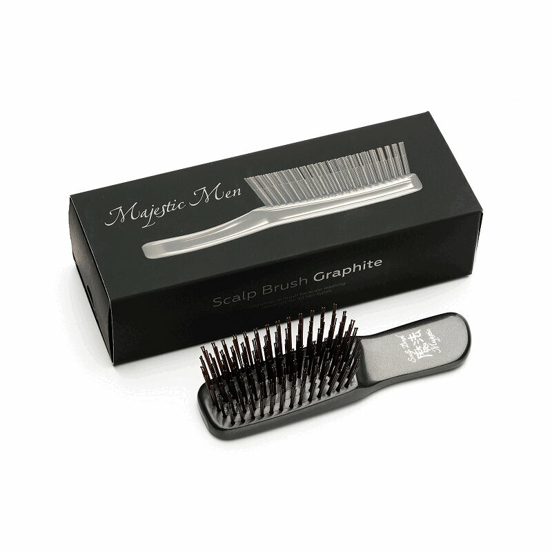 Трихологическа расческа Majestic Men для волос любого типа и мужской бороды. Удобно брать в путешествие. Она работает также как и большие модели Majestic и применяется для мытья головы и массажа. 284 зубчика с литыми наконечниками тщательно очищают более сорока тысяч пор от скопившихся загрязнений, а эффект легкого пилинга обеспечивает устранение старых клеток - кожа начинает дышать.