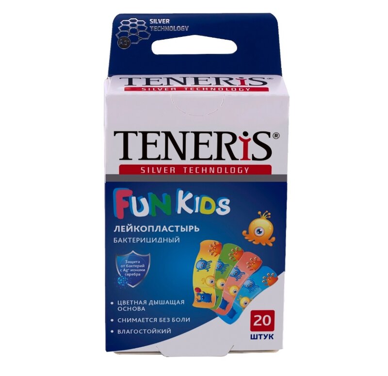 Набор бактерицидных лейкопластырей на основе перфорированной полимерной пленки с картинками мультяшных героев. Влагоустойчивый, надежно защищает ранку во время купания. Пропускает воздух. Антисептик - бензалкония хлорид. Впитывающая подушечка с атравматической сеткой с ионами серебра 20 шт в упаковке.