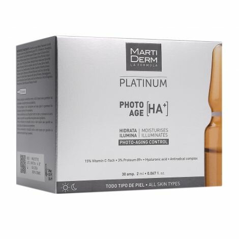 Ампулы Photo-Age HA+ - это новая супер увлажняющая версия ампул Photo-Age. Это результат синергии между витамином С, Proteum 89+ и, теперь, гиалуроновой кислотой. Это легко впитываемый блистер, который увлажняет и осветляет кожу, а также разглаживает и предупреждает появление морщин, достигая более упругой кожи. Активные компоненты: • Благодаря 15% витамину C-Tech, 3% Proteum 89+, низкомолекулярной гиалуроновой кислоте, Антирадикальному комплексу и Repair Complex, он предотвращает и уменьшает признаки фотостарения, такие как мимические линии, морщины, пятна и потеря упругости, а также защищает кожу от ежедневных агрессий. • Photo-Age HA+, благодаря своей новой формуле с гиалуроновой кислотой , обеспечивает на 42% больше гидратации по сравнению с предыдущей формулой. А также защищает, восстанавливает, осветляет и придает коже структуру.
