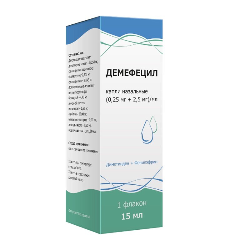 На 1 мл: диметиндена малеат - 0.25 мг; фенилэфрина гидрохлорид (соответствует 2.5 мг фенилэфрина) - 3.045 мг. Вспомогательные вещества: натрия гидрофосфат безводный - 4.4 мг, лимонной кислоты моногидрат - 2.6 мг, сорбитол - 35.0 мг, бензалкония хлорид - 0.1 мг, лаванды масло - 0.2 мг, вода очищенная - до 1 мл.