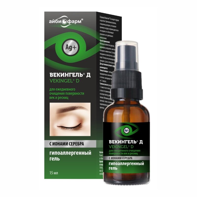 Векингель д гель гипоаллергенный для ежедневного очищения поверхности век и ресниц «векингель д»r («vekingel d»r) - новое поколение гелей для век. Гигиена век - основа лечения синдрома сухого глаза и блефаритов!Внешний вид и свойства: Гелеобразная текстура от прозрачного до светло-желтого цвета, без запаха. Ограничений по возрасту нет.Может быть использовано в качестве композиции для проведения гигиены век, направленной на профилактику и лечение заболеваний век и глазной поверхности - блефаритов, мейбомиитов, ячменей и халязионов, а также синдрома сухого глаза.Уникальная гипоаллергенная формула Векингеля Д основана на действии трех ключевых компонентов - Гиалуроновой кислоты, Глицерата серебра, препарата серы.АКТИВНЫЕ ИНГРЕДИЕНТЫ:• Гиалуроновая кислота природного происхождения, входящая в состав Векингеля Д, позволяет эффективно очистить и увлажнить поверхность века от слизи, чешуек и корочек, включая зону роста ресниц. Молекулы гиалуроновой кислоты не только удерживают воду на поверхности кожи, но и улучшают структуру кожи, сохраняя ее упругость.• Глицинат серебра, обладая противомикробным действием, защищает поверхность века от воздействия бактерий, следовательно, препятствует развитию воспаления век.• Препарат серы (сульфаконцентрол) известен своим противопаразитарным свойством, что позволяет подавить активность размножения паразитов, включая клещей рода Demodex.Комплексное воздействие компонентов Векингеля Д, сохраняя естественную флору, позволяет бережно очищать поверхность века и восстанавливать работу желез, расположенных в толще века, секрет которых защищает поверхность глаза.Оригинальная упаковка, оснащенная дозатором, не позволяет проникнуть воздуху во флакон даже после его вскрытия, что обеспечивает возможность его длительного использования.Специальные особенности: без ароматизаторов, без красителей, гипоаллергенно
