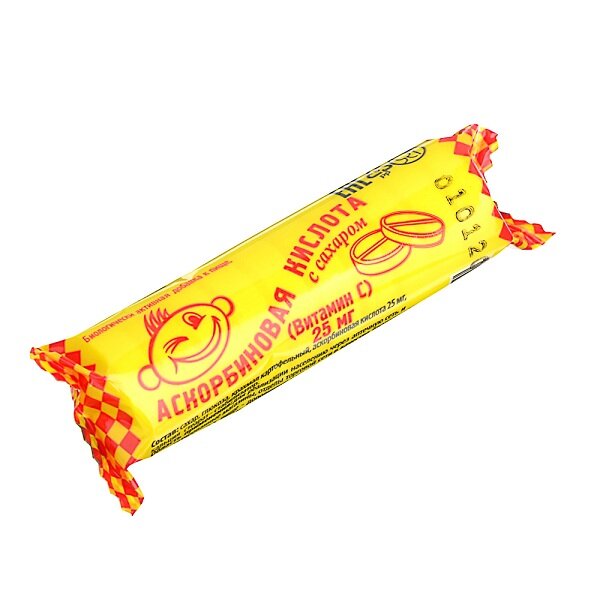 1 таблетка содержит:аскорбиновой кислоты - 25 мг сахароза (сахар) - 2,064 гглюкозы (декстрозы) - 0,830 г. Вспомогательные вещества:крахмал картофельный,лимонная кислота,магния стеарат.