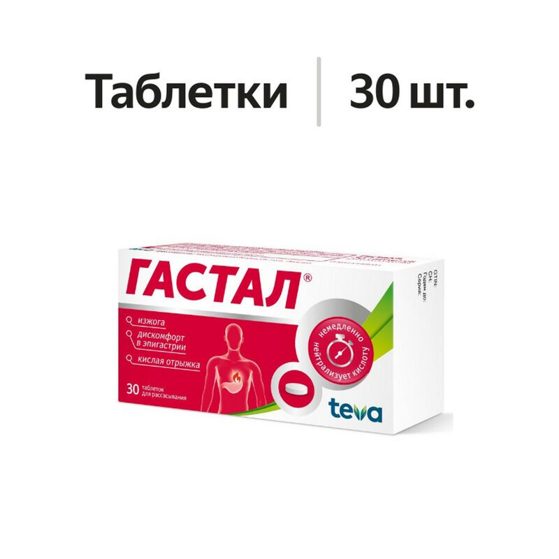 Алюминия гидроксида-магния карбоната гель и магния гидроксид обеспечивают немедленную (сразу же после приема) и продолжительную (около 2 ч) нейтрализацию соляной кислоты желудочного сока, с поддержанием кислотности в желудке на физиологическом уровне (pH 3-5). 1 таблетка препарата Гастал® нейтрализует около 21.5 ммоль соляной кислоты.