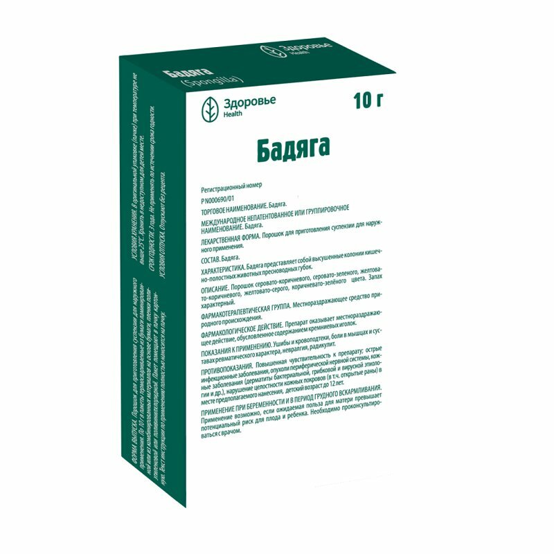 Местнораздражающее средство, которое получают из пресноводной губки бадяги, представляет собой колонии кишечнополостных животных – Spongilla lacustris fragilis, Ephydatia fliviatilis. Губка живет только в исключительно чистых пресноводных водоемах с проточной водой и при определенных температурах. Скелет бадяги состоит из петлистой сети игл кремнезема, связанных между собой органическим веществом – спонгином. В него входят также фосфаты, карбонаты и органические вещества. Действие бадяги основано на механическом раздражении кожи, обусловленном содержанием кремниевых иголок.