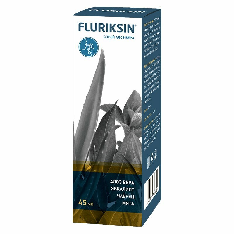 Спрей Fluriksin Алоэ Вера Компоненты, входящие в состав Fluriksin® Алоэ Вера спрей, комплексно действуют на слизистую оболочку и обеспечивают гигиенический и профилактический уход за полостью рта. Алоэ Вера положительно влияет на регенерацию тканей слизистой оболочки рта и горла. Обладает противовоспалительным, антибактериальным и антисептическим свойством, что способно эффективно помочь уменьшить воспаление в горле. Эвкалипт содержит эфирные масла, дубильные вещества, горечи, органические кислоты. Благодаря богатому составу является противовоспалительным средством и природным антисептиком. Эвкалипт борется с патогенными микроорганизмами, способствует снятию воспаления и снижает боль в горле и ротовой полости. Чабрец обладает эффективным противомикробным действием благодаря своему основному активному соединению, тимолу. Это вещество влияет на грамположительные, и грамотрицательные бактерии, помогает снять воспаление и дезинфицировать полость рта. Мята чрезвычайно эффективное средство против анаэробных бактерий, существующих в среде с низким содержанием кислорода (например, в ротовой полости), и способных вызывать заболевания дёсен, борется с неприятным запахом изо рта. Способствует облегчению воспалительных процессов и устранению болевого синдрома в полости рта и горле.
