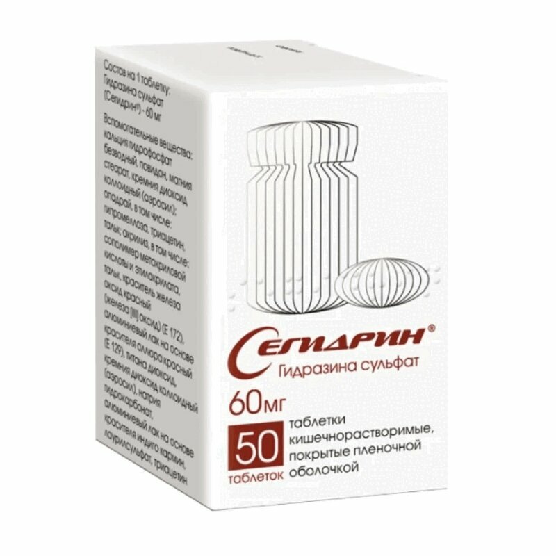 Активное вещество: гидразина сульфат (Сегидрин) 60 мг. Вспомогательные вещества: кальция гидрофосфат 304 мг, повидон низкомолекулярный 24 мг, магния стеарат 4 мг, кремния диоксид коллоидный (аэросил) 8 мг, сополимер метакриловой кислоты 131 мг, тальк 3,3 мг, макрогол 400 1,3 мг, титана диоксид 1,3 мг, краситель железа оксид красный (железа {III} оксид) (Е 172) 0,65 мг, диметикон 0,45 мг.