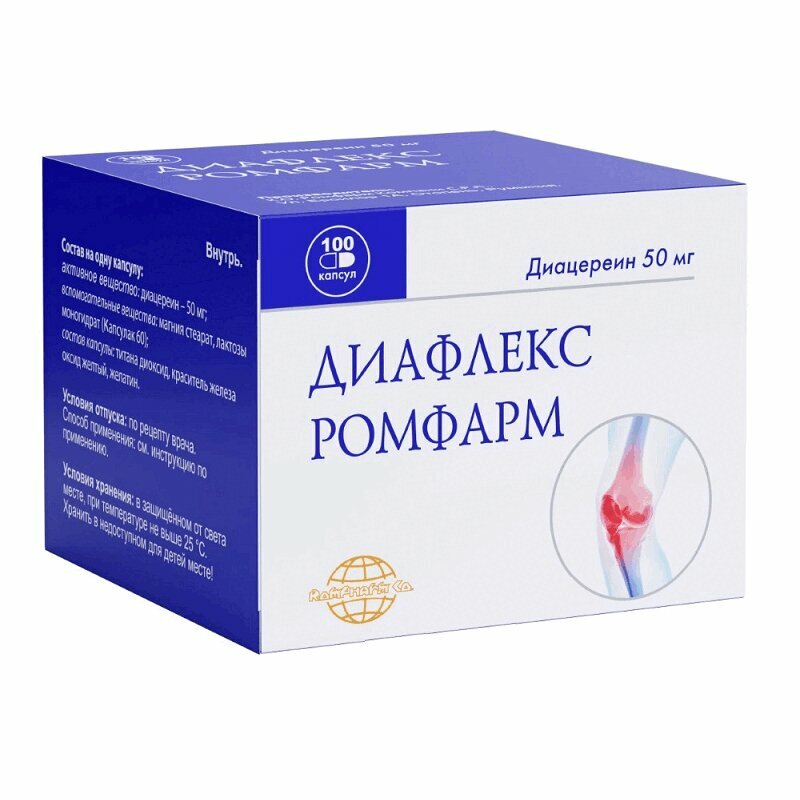На 1 капсулу: диацереин 50 мг. Вспомогательные вещества: магния стеарат - 12.5 мг, лактозы моногидрат (капсулак 60) - до 250 мг. Состав капсулы: титана диоксид - 0.75 мг, краситель железа оксид желтый - 2.2125 мг, желатин - до 75 мг.
