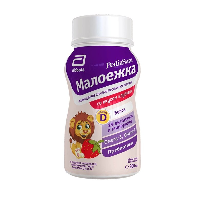 Смесь Similac ПедиаШур Малоежка со вкусом клубники предназначена для детей с 1 до 10 лет. Продукт применяется для оптимизации питания детей с недостаточным питанием, риском недостаточного или неполноценного питания и невозможностью приема твердой пищи. Важно: Продукт может быть использован в качестве единственного источника питания или как дополнение к основному рациону. Применять под наблюдением врача. Не давать детям в возрасте до одного года. Не использовать при галактоземии. Не содержит лактозы. Не содержит глютена. Не содержит ГМО. Не для парентерального (внутривенного) введения.
