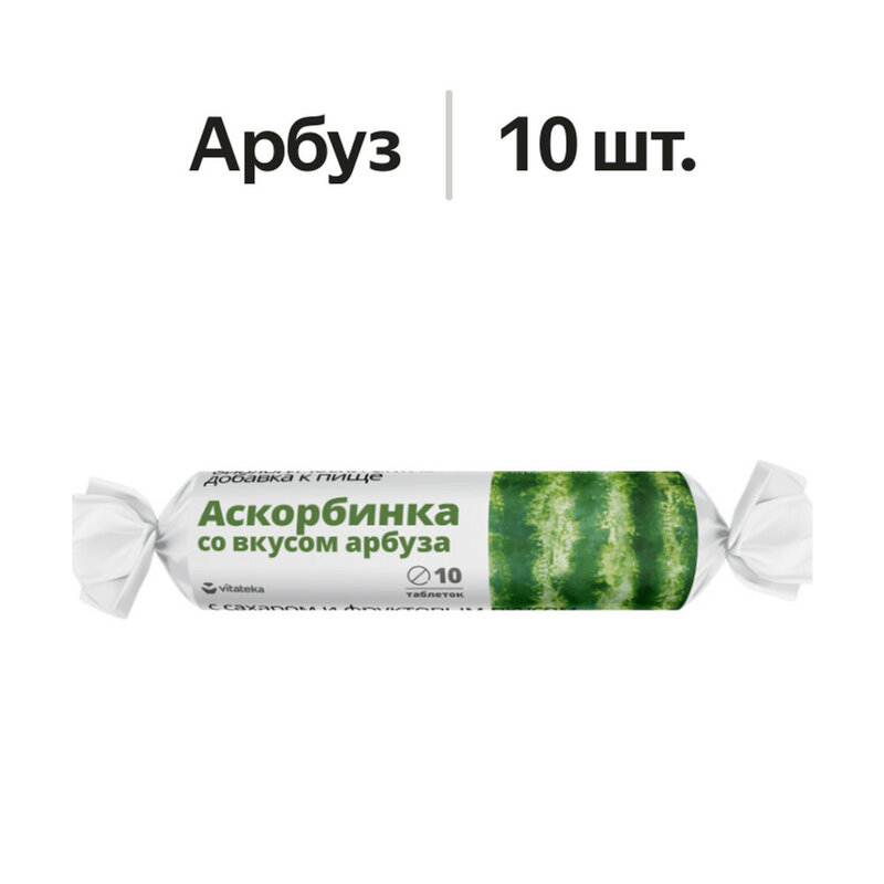 аскорбиновая кислота 25 мг, сахар, глюкоза, крахмал картофельный, стабилизатор: стеарат кальция, ароматизатор «Арбуз»