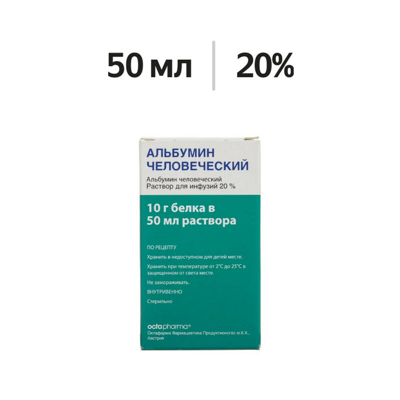 Действующее вещество: альбумин человека - раствор содержит 200 г/л общего белка (не менее 95 % альбумина), произведенного из человеческой плазмы. Вспомогательные вещества: каприловая кислота 16 ммоль/л, N-ацетилтриптофан 16 ммоль/л, вода для инъекций до 1 л.