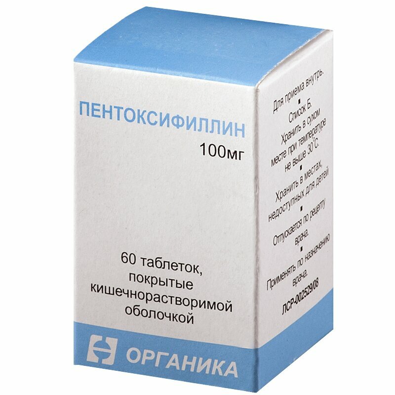 1 таблетка содержит: действующее вещество: пентоксифиллин - 100.00 мг; вспомогательные вещества лактозы моногидрат (сахар молочный) - 32,00 мг, крахмал картофельный - 22,42 мг, метилцеллюлоза водорастворимая - 0.48 мг. повидон (поливинилпирролидон низкомолекулярный), пласдон К-17 - 3,50 мг, стеариновая кислота - 1,60 мг; состав оболочки: триэтилцитрат -1,50 мг, акрил-из 93А18597 белый - 13.50 мг или другая пленкообразующая система с указанным составом: метакриловой кислоты сополимер, тип С -66,0 % тальк -16,5 %. титана диоксид -15,0 %, кремния диоксид -1,0%, натрия бикарбонат -1,0%, натрия лаурилсульфат-0,5%.