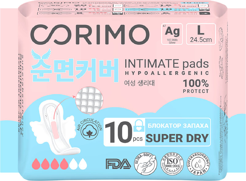 Технологичные и безопасные гигиенические женские прокладки с фигурными крылышками Corimo разработаны совместно с лабораторией в Южной Корее. Прокладки обладают бактериостатическими свойствами, гипоаллергенны. Материалы прокладки не вызывают раздражений, высыпаний. Ультрамягкий верхних слой из нетканого материала без химических пропиток с отверстиями в виде воронки быстро пропускает жидкость внутрь прокладки и блокирует ее внутри. Японский суперабсорбент превращает жидкость в гель и впитывает в 30 раз больше своего веса. Нижний слой имеет микропоры, пропускающие воздух, но не жидкость.