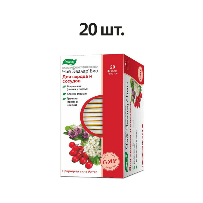 Чай Эвалар Био для сердца и сосудов - это биологически активная добавка к пище, разработанная специалистами Evalar на основе природных компонентов. В составе чая присутствуют эТрава клевера, цветки и листья боярышника, трава и цветки гречихи, трава мелиссы, листья земляники, листья черной смородины, листья мяты перечной. Эти компоненты помогают укрепить сердечно-сосудистую систему, снизить уровень холестерина в крови, улучшить метаболизм и насытить организм необходимыми витаминами и минералами.