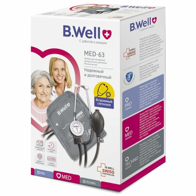 B.Well MED-63 — удобный механический тонометр со стетоскопом в комплекте. Благодаря встроенному стетоскопу и манжете с кольцом MED-63 подходит даже для самостоятельного контроля давления. Точный и надежный тонометр B.Well MED-63 имеет манометр с металлическим корпусом и удобной шкалой. Манжета для руки с обхватом 22-42 см отличается комфортом и надежностью, сделана из плотного нейлона с окантовкой края, имеет удлиненную застежку для прочной фиксации и эргономичный скругленный край для удобного надевания. Камера манжеты выполнена из латекса по бесшовной технологии. Нагнетатель позволяет комфортно накачать манжету и плавно выпустить воздух. Механический тонометр MED-63 надежен и долговечен, он подойдет для профессионального применения, но будет особенно удобен для домашней аптечки.