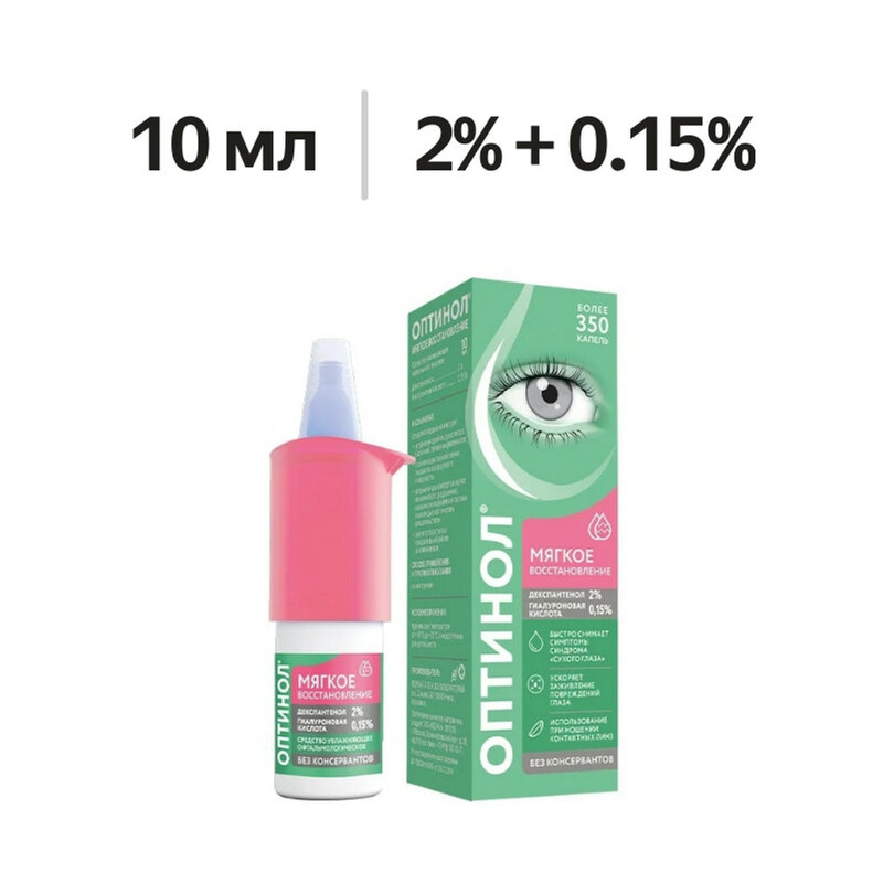 Средство увлажняющее офтальмологическое "Оптинол" Мягкое восстановление предназначено для интенсивного и длительного увлажнения глаз и показано к применению: после офтальмологических хирургических операций, а также при повреждениях и травмах роговицы; при ношении всех типов контактных линз для устранения дискомфорта; при синдроме "сухого глаза" (с симптомами дискомфорта, сухости, чувства инородного тела "песка в глазах", жжения, раздражения); для снятия усталости глаз при интенсивной зрительной нагрузке.