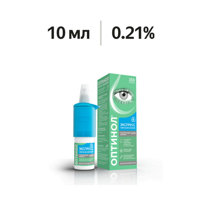 В составе «Оптинол» Экспресс увлажнение используется натрия гиалуронат, который имеет меньший молекулярный размер по сравнению с гиалуроновой кислотой, что позволяет веществу легче проникать в ткани и обеспечивать образование равномерного, стабильного и устойчивого защитного слоя на роговице глаза, не влияя на остроту зрения.