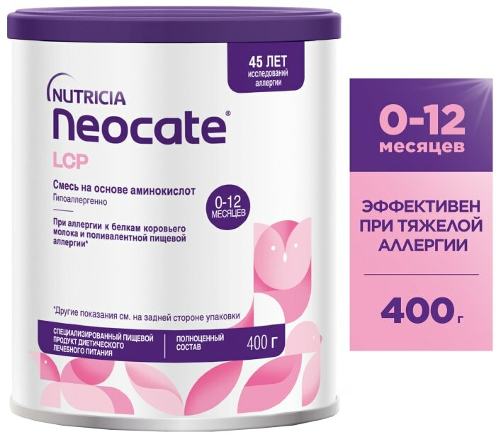 Смесь Neocate LCP на основе аминокислот 400 г создана для детей с тяжелой пищевой аллергией и пищевой непереносимостью. Формула Neocate LCP - это высокое количество жирных кислот ARA/DHA и высокое содержание легкоусвояемых жиров. Неокейт LCP является продуктом на основе не аллергенных аминокислот и не содержит белок коровьего молока. Содержит длинноцепочечные полиненасыщенные жирные кислоты и нуклеотиды. Обращаем Ваше внимание, продукт временно может приходить как в старом, так и в новом дизайне. Новый дизайн - та же экспертная формула.