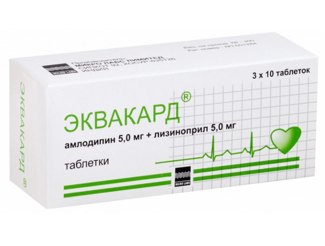 Повышенная чувствительность к какому-либо из компонентов препарата или к другим производным дигидропиридина, другим ингибиторам АПФ; ангионевротический отек в анамнезе, в том числе вызванный применением других ингибиторов АПФ; наследственный и/или идиопатический ангионевротический отек; гемодинамически значимый стеноз аорты или митрального клапана или гипертрофическая обструктивная кардиомиопатия; тяжелая артериальная гипотензия (систолическое АД менее 90 мм рт.ст.); кардиогенный шок; беременность, период лактации; возраст до 18 лет; острый инфаркт миокарда (в течение первых 28 дней), нестабильная стенокардия (за исключением стенокардии Принцметала); непереносимость лактозы, дефицит лактозы и глюкозо-галактозная мальабсорбция. С осторожностью: цереброваскулярные заболевания (в т.ч. недостаточность мозгового кровообращения), ИБС, коронарная недостаточность, артериальная гипотензия, системные заболевания соединительной ткани (в т.ч. склеродермия, системная красная волчанка), угнетение костномозгового кроветворения, гиперкалиемия, состояние после трансплантации почки, почечная и/или печеночная недостаточность, синдром слабости синусового узла (выраженная брадикардия, тахикардия), хроническая сердечная недостаточность неишемической этиологии III-IV функционального класса по классификации NYHA, сердечная недостаточность в стадии декомпенсации, аортальный стеноз, митральный стеноз, острый инфаркт миокарда (после первых 28 дней), пожилой возраст, двусторонний стеноз почечных артерий или стеноз артерии единственной почки с прогрессирующей азотемией, гемодиализ с использование высокопроточных диализных мембран (AN69®), азотемии, первичный гиперальдостеронизм, состояния, сопровождающиеся снижением объема циркулирующей крови (ОЦК) (в том числе в результате диареи, рвоты); применение у пациентов, находящихся на диете с ограничением поваренной соли. Применение при беременности и кормлении грудью Применение препарата Эквакард® не рекомендуется во время беременности. При диагностировании беременности прием препарата Эквакард® необходимо прекратить как можно раньше. Прием ингибиторов АПФ во II и III триместре беременности оказывает неблагоприятное воздействие на плод (возможны выраженное снижение АД, почечная недостаточность, гиперкалиемия, гипоплазия костей черепа, внутриутробная смерть). Данных о негативных влияниях препарата на плод в случае применения во время I триместра нет. За новорожденными и грудными детьми, которые подверглись внутриутробному воздействию ингибиторов АПФ, рекомендуется вести тщательное наблюдение для своевременного выявления выраженного снижения АД, олигурии, гиперкалиемии. Безопасность применения амлодипина во время беременности не установлена, поэтому применение при беременности возможно только в том случае, когда польза для матери превышает потенциальный риск для плода. Лизиноприл проникает через плаценту. Нет данных о проникновении лизиноприла в грудное молоко. Отсутствуют данные, свидетельствующие о выделении амлодипина в грудное молоко. Однако известно, что другие БМКК - производные дигидропиридина, экскретируются с грудным молоком. Применение препарата Эквакард® в период кормления грудью не рекомендуется. Если применение препарата необходимо в период лактации, то грудное 